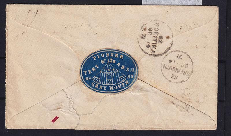 1871 (OC14) Local Cover with 2d Orange Full Face Queen tied by Obliterator ‘20’ (Greymouth) Obliterator cancel addressed to Stafford Tow,West Coast. Backstamped Greymouth & Hokitika cancels. Also PIONEAR TENT/Greymouth blue label on the back. Fine & Interesting item (1)