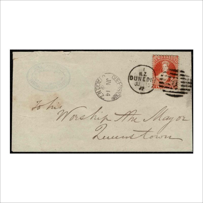 1872 (JU10) Advertising Cover (R Blackadder/Octagonal Dunedin/Iron & Machine Depot Oval violet cachet at top left with 2d Orange tied by DUNEDIN/O cancel to Queenstown. Has Queenstown/Otago JN 14 72 receiving cancel. Addressed To his Worship the Mayor,Queenstown. Minor age. Otago Province Cover (1)