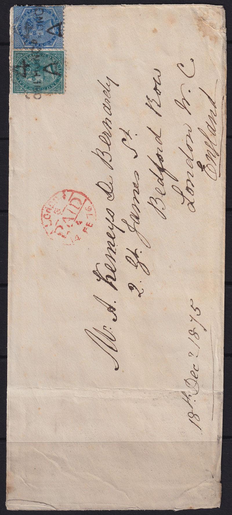 1875 (DE16) Long Cover to England with 1/- Green & 6d Blue both tied by ‘4/ONEHUNGA/A’ Early Obliterator cancel. Has a London Paid 4 FE 76 receiving cancel. Backstamped Onehunga,Auckland & London cancels. The cover has a light vertical crease and light ageing. (1)