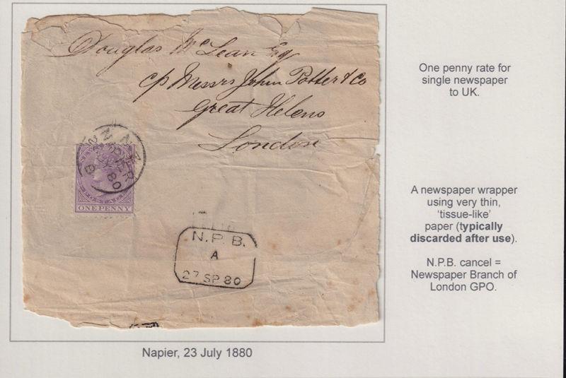1880 (23JY) Part Newspaper Wrapper to London with a 1d Lilac tied by Napier cancel. Has NPB 27 SP 80 (Newspaper Branch London) receiving cancel. Hass light creases. Very Scarce (1)