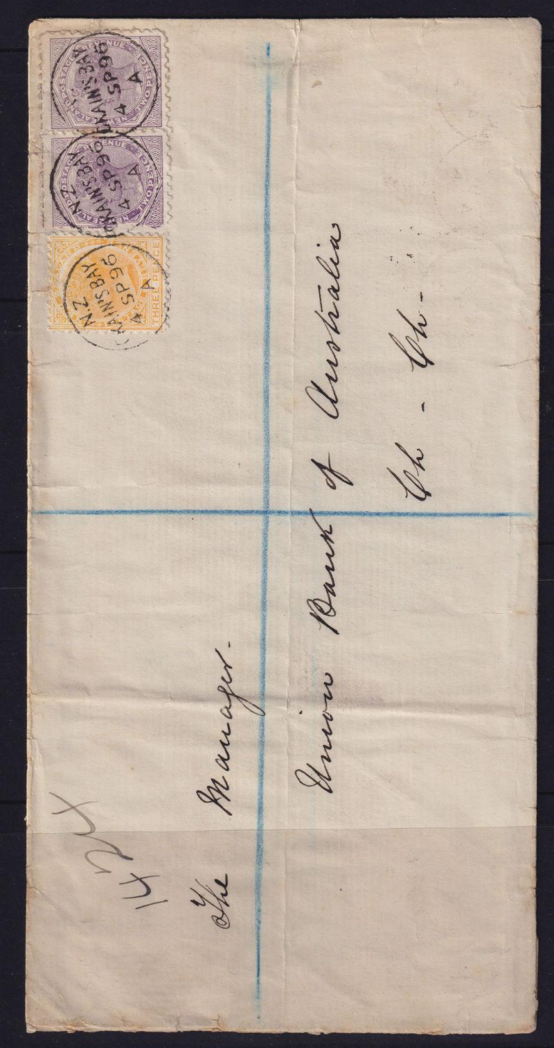 1896 (4SP) Long Registered Union Bank of Australia Cover with 3d Yellow & 2d Lilac Pair 2nd Sidefaces tied by fine OKAIN’S Bay cancels. Backstamped Lyttelton & Christchurch cancels. Minor blemishes and horizontal light crease. Banks Peninsula PO (1)