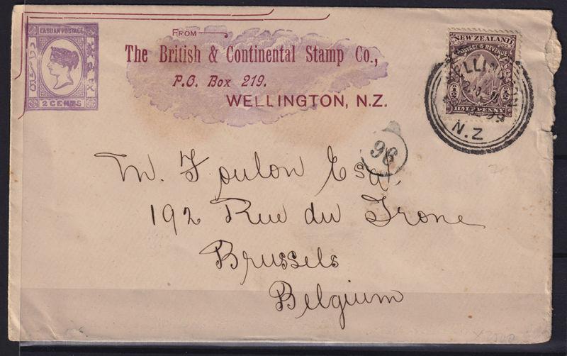 1899 (10JE) Printed ‘The British & Continental Stamp Co/Wellington’ Printed Cover with 1/2d Mt Cook Posted at Wellington to Belgium. Minor ageing. (1)
