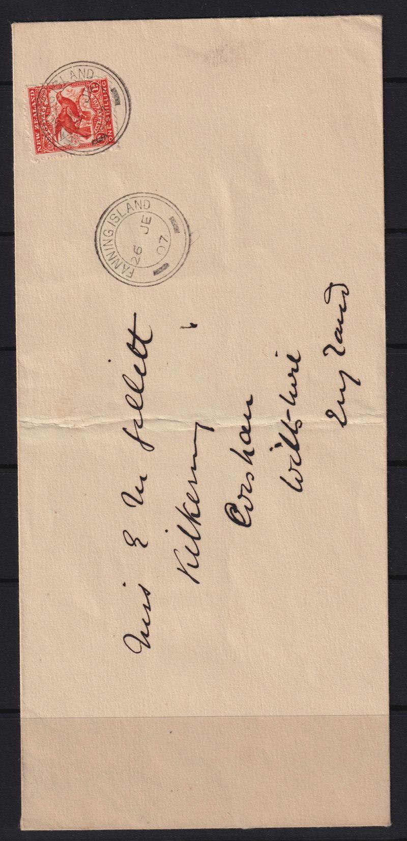 1907 (26FE) Long Cover to England with 1/- Kea & Kaka tied by FANNING ISLAND cancel. The cover has a light vertical fold. Rare High Value Cover (1)
