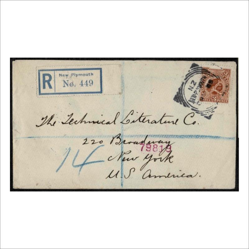 1908 (29MY) Registered Commercial Cover to USA with 3d Reduced tied by NEW PLYMOUTH Squared cancel. Backstamped Auckland & new York Registered cancels. (1)