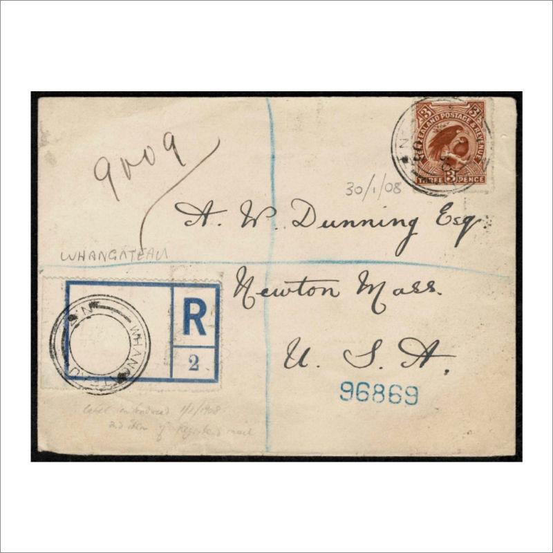 1908 (JA30) Registered Cover to USA with 3d Huias Reduced tied by light WHANGATEAU cancel (PO Open 1904-29 Rated 10) with early registration label with undated cancel. Backstamped Auckland Registered,Chicago Registered & Newton Mass. Minor ageing (1)
