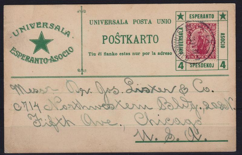 1914 (4AP) Esperanto Printed Postcard to USA with 1d Dominion tied by Dargaville cancel. (1)
