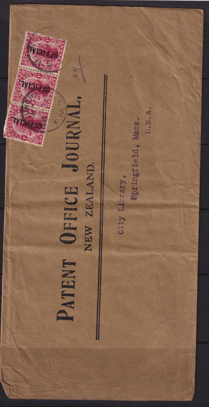 1916 (10AU) Patent Office Journal,New Zealand Brown Printed Wrapper to USA with 1d Dominion Officials Strip of 3 tied by WELLINGTON FMB cancel. Fine Wrapper (1)