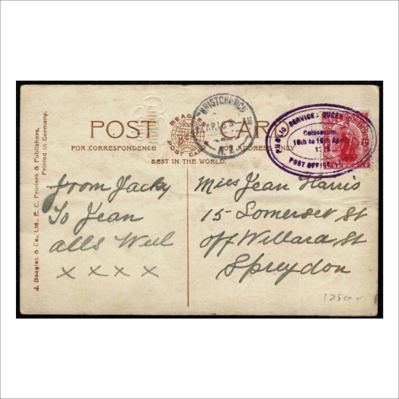1916 (17AP) Picture Postcard with 1d Dominion tied by fine Oval ‘Public Service/Queen’s Carnival/Post Office/CHCH’ violet cancel. Fine & Rare Temporary Post Office (1)