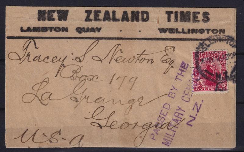 1916 (30MR) New Zealand Times/Lambton Quay/Wellington Small Wrapper to USA with 1d Dominion Posted at Wellington with ‘Passed By The/Military Censor/NZ’ violet cachet. (1)