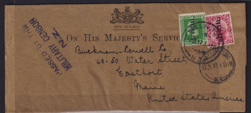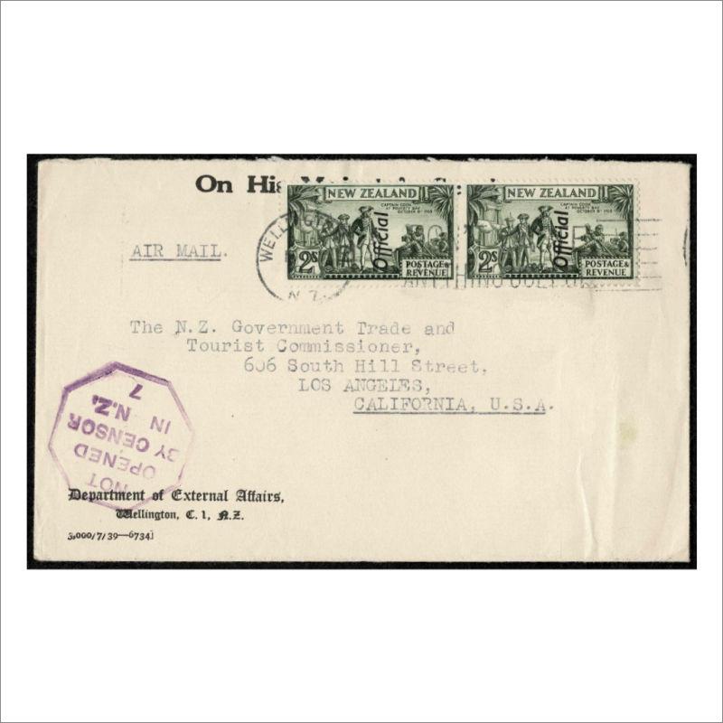 1941 (16JL) Small OHMS/Department of External Affairs,Wellington with 2/- Captain Cook Officials Pair Posted at Wellington addressed to ‘The NZ Government Trade and Tourist Commissioner,Los Angeles’ Has Octagonal Opened By Censor in NZ/7 violet cachet at bottom left. No backstamps (1)