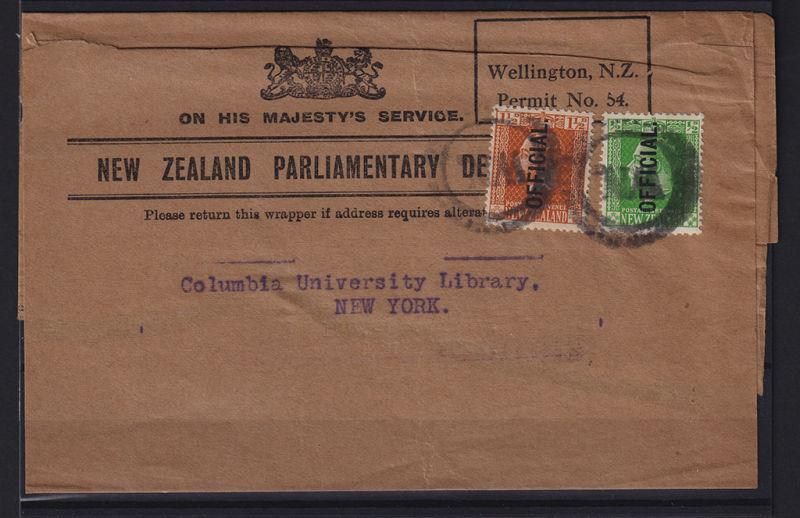 1920’s OHMS New Zealand Parliamentary Debates/Wellington Printed Wrapper with KGV 1 1/2d Orange-Brown & 1/2d Green both tied by ‘WN’ Parcel Obliterator cancels addressed to Columbia University Library,New York. (1)