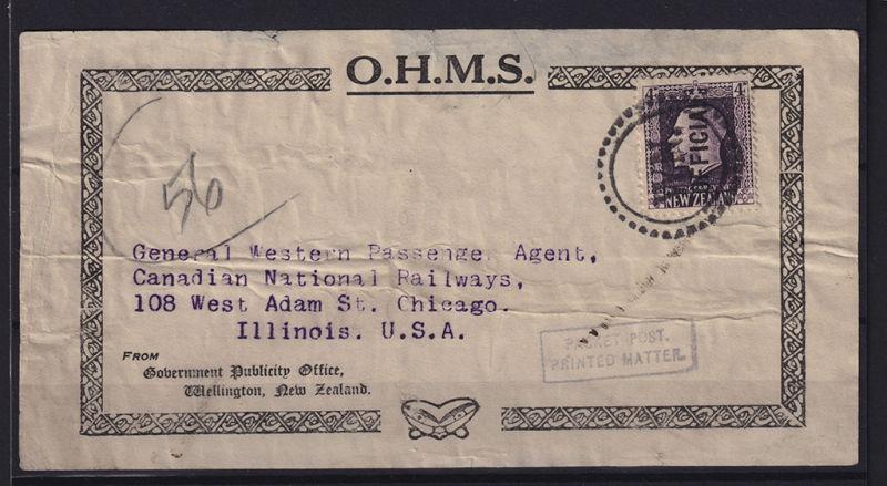 1920’s OHMS/Government Publicity Office,Wellington NZ Printed Address label with KGV 4d Violet tied by ‘WN’ Parcel Obliterator cancel to USA. Has small ‘Packet Post/Printed Matter’ violet cachet. Light creasing (1)