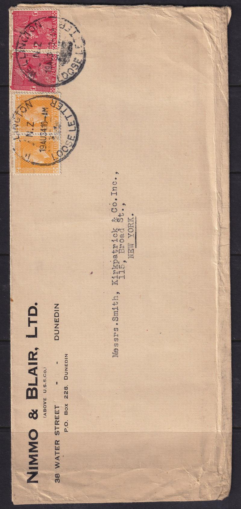 1934 (19AU) Nimmo & Blair Ltd/Dunedin Long Printed Commercial Cover to New York with KGV 2d Yellow & 1d Field Marshal Pairs tied by WELLINGTON/LOOSE LETTER cancels. No backstamp. Light edge creasing (1)