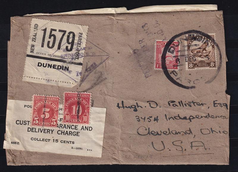 1935 (6DE) Parcel Wrapper with 1d Kiwi & 8d Tuatara tied by DUNEDIN PARCELS cancel to USA. Has NZ 1579 Parcel Post/Dunedin Printed label plus US 5c & 10c Postage Dues tied. Has a Large Parcel Post label on the back. (1)