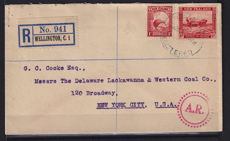 1936 (16OC) NZ Society of Accountants Small Printed Registered Cover with 1d Kiwi & 6d Harvester tied by Wellington Registered cancel to USA. Has fine ‘AR’ red cachet at bottom right. Fine AR Cover (1)