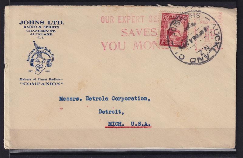 1938 (4AP) Printed Johns Ltd/Radio & Sports Small Cover with 1d Red Meter & 1d Kiwi tied by AUCKLAND SHIPSIDE cancel to USA. Scarce PO cancel (1)