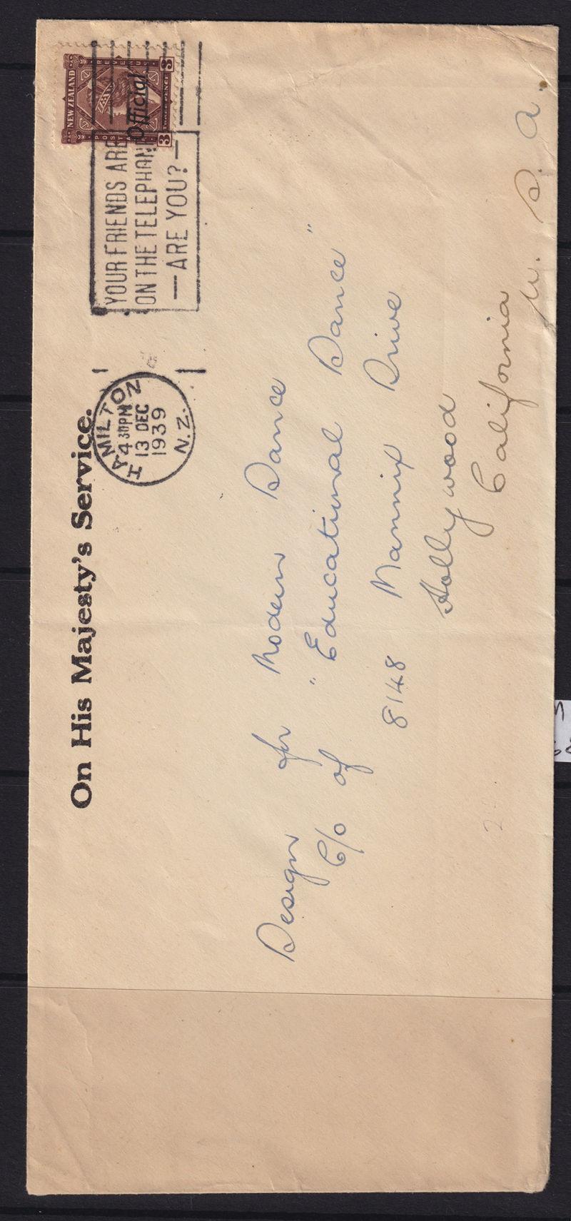 1939 (13DE) Long OHMS Cover to USA with 3d Wahine Official tied by Hamilton machine cancel. No backstamps. The cover has light ageing. Very Scarce single rate cover (1)