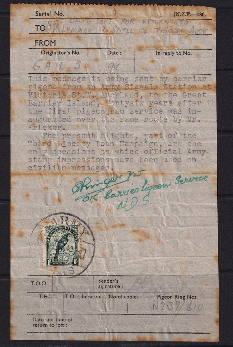 1943 Pigeon Post Message sent from the Army Signals Station,Victoria Street,Auckland to Great Barrier Island. Has 1/- Tui tied by Army Signals cancel. Signed for the Barrier Pigeon Service. The entire has staining. Interesting item (1)