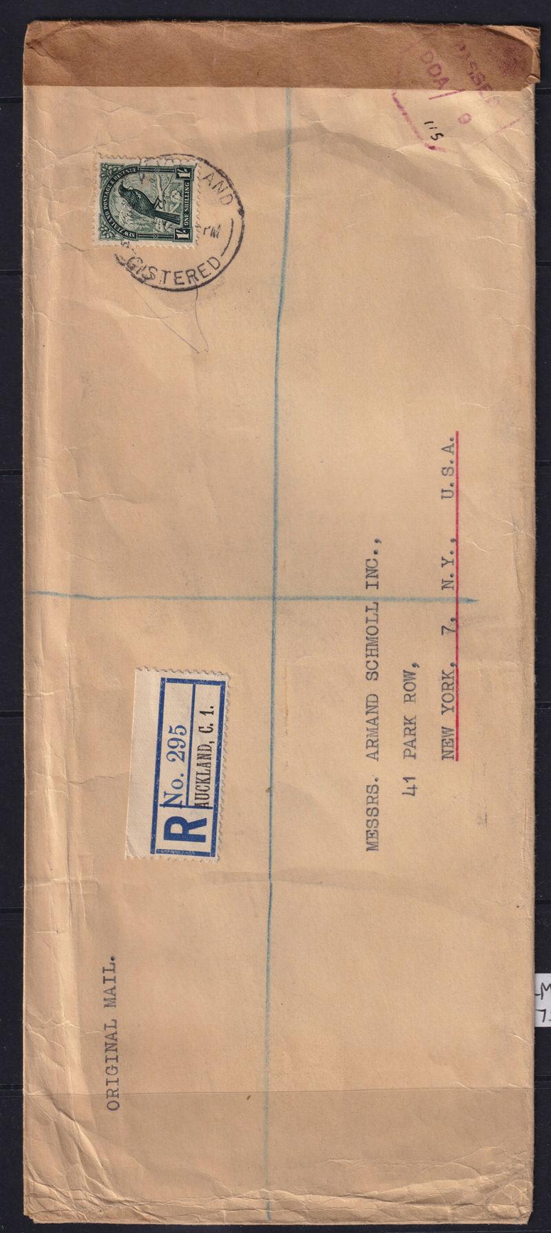 1944 Long Registered Cover to USA with 1/- Tui tied by part Auckland Registered cancel. censored at lower right. Backstamped New York Reg, San Pedro Registered & Churchill St Annex Registered cancels. minor edge creasing. Scarce single rate cover (1)