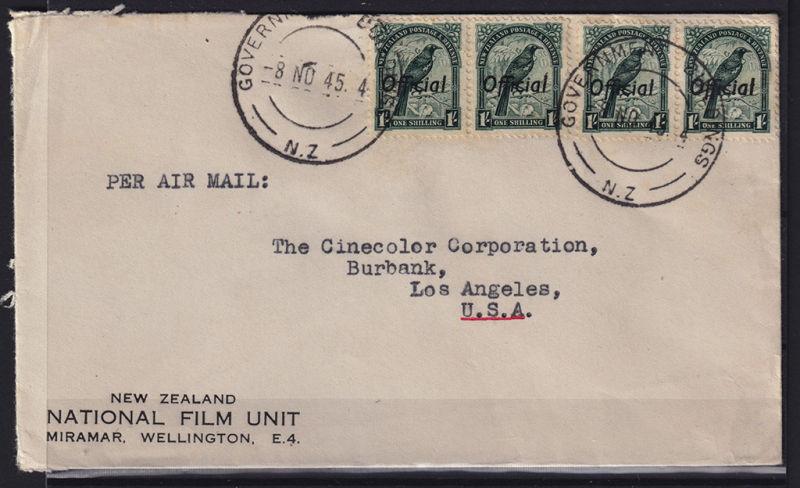 1945 (8NO) Printed NZ National Film Unit small cover with 4x 1/- Tui Officials tied by Government Buildings cancel to USA. No backstamps. Fine Official Cover (1)