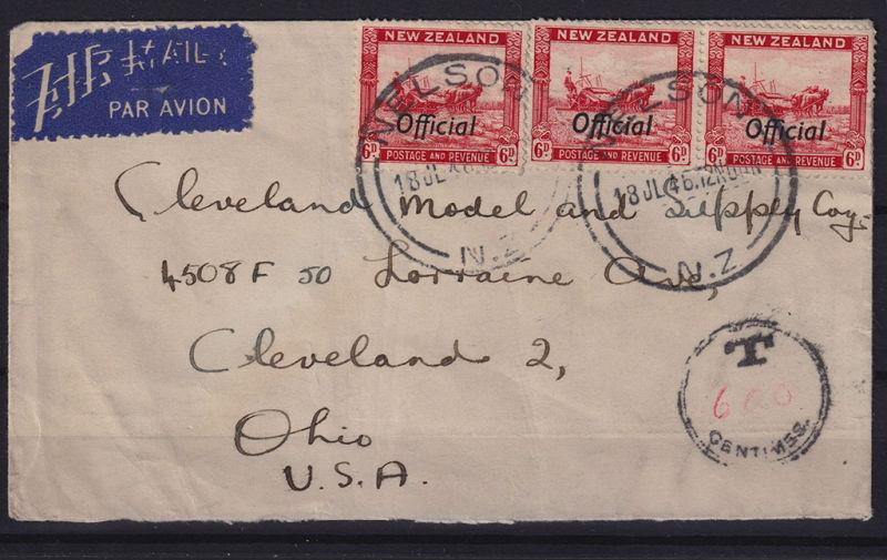 1946 (18JL) Airmail Cover to USA with 3x 6d Harvester Officials tied by Nelson cancels. Has a Postage Due cachet. No backstamp. (1)
