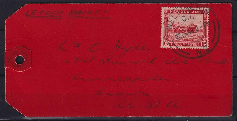 1946 (23JA) Red Mail Tag endorsed ‘Letter Packet’ with 6d Harvester tied by Wellington cancel to USA. Fine item (1)