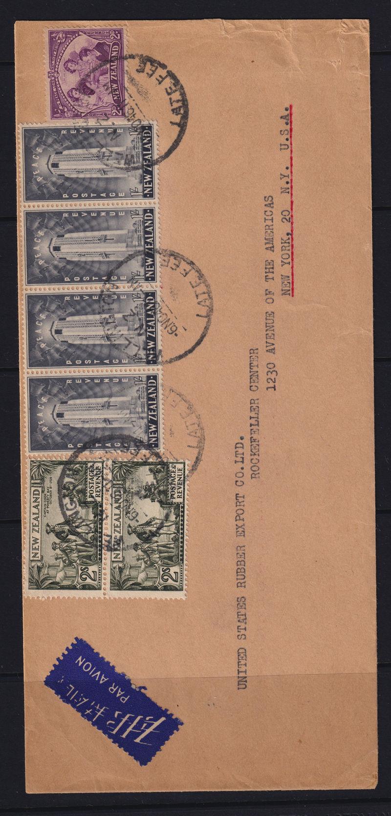 1946 (6NO) Airmail Long Cover to USA with ‘35 2/- Captain Cook Pair, ‘46 Peace 1/- Black (4) & 2d values all tied by Wellington Late Fee cancels. Commercial Cover. No backstamps. (1)