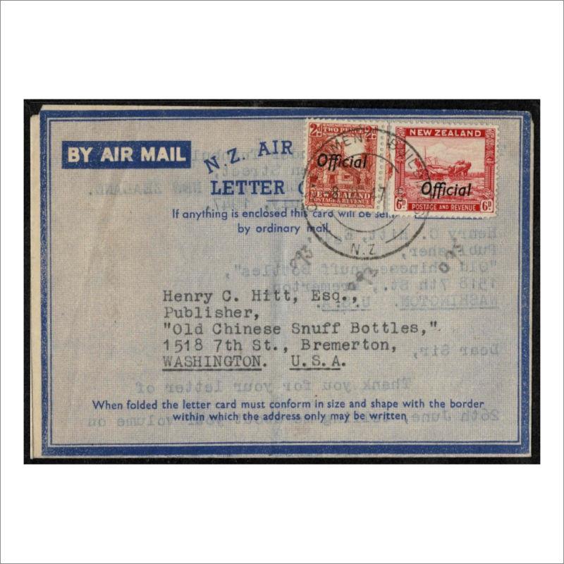 1947 (8JE) NZ Airmail Letter Card sent by the Alexander Turbull Library,Wellington with Officials 2d & 6d Pictorials tied by Government Buildings to USA. Fine Item (1)