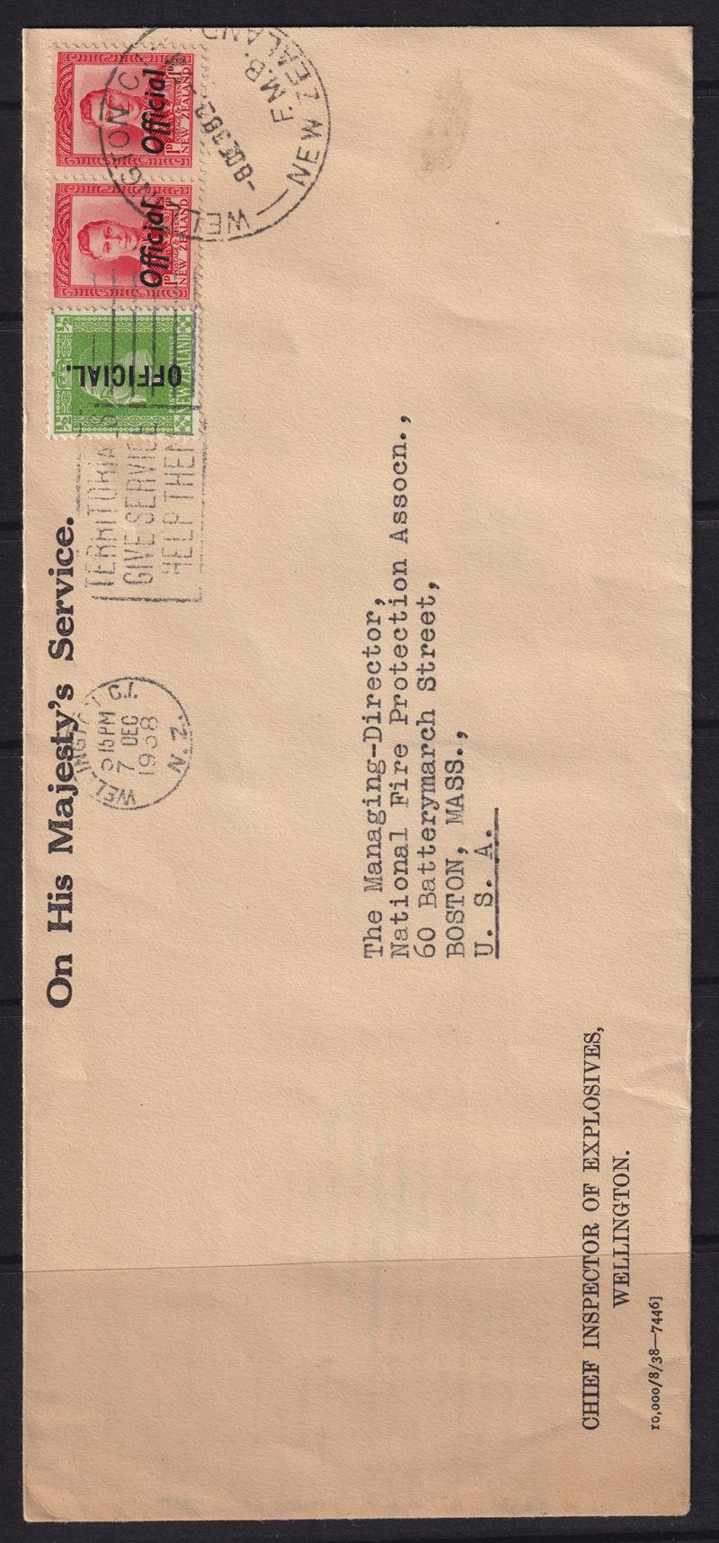 1938 (7DE) OHMS/Chief Inspector of Explosives,Wellington Printed Long Cover to USA with KGV 1/2d Green plus KGVI 1d Red Pair tied by Wellington machine cancel plus Wellington FMB cancels. No backstamps (1)