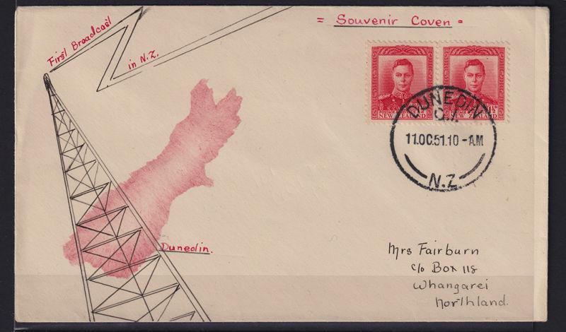 1951 (11OC) Purdon Handdrawn Cover ‘First Broadcast on NZ’ with KGVI 1 1/2d Red Posted at Dunedin. (1)