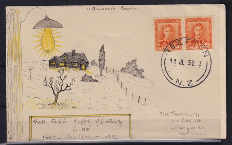 1952 (11JL) Purdon Handdrawn Cover ‘First Public Supply of Electricity in NZ/1887 Reefton 1952’ with KGVI 2d Orange Pair tied by Reefton cancel. Nice Cover (1)
