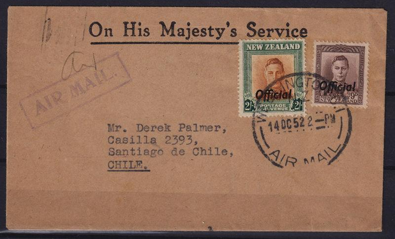 1952 (14OC) OHMS Small Cover with 2/- & 9d Officials tied by Wellington Airmail cancel to CHILE. No backstamp. Good Destination Item (1)