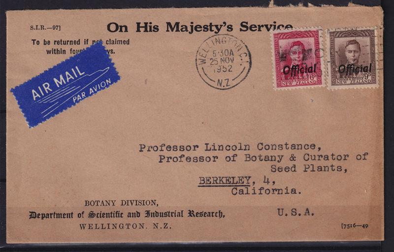 1952 (25NO) Small OHMS/Botany Division,Department of Scientific and Industrial Research,Wellington Cover to USA with KGVI 6d & 9d Officials tied by Wellington machine cancels. No backstamps. (1)