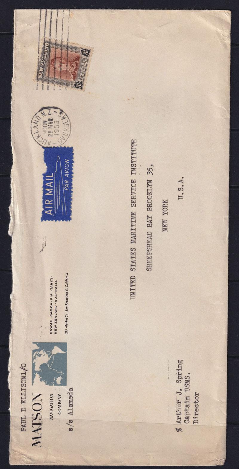 1953 (28MR) Printed MATSON Navigation Company Airmail Cover endorsed S/S Alameda to USA with 3/- value tied by Auckland Overseas cancels. No backstamps. A good single rate cover (1)