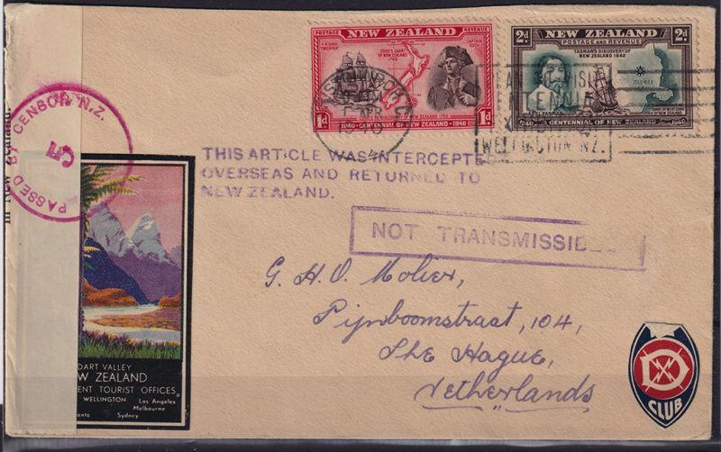 1940 (1AP) Censored Cover to Netherlands with 1940 1d & 2d Centennial stamps Posted at Christchurch. Has ‘This Article was Intercepted Overseas and Returned to New Zealand’ & ‘Not Transmissible’ boxed violet cachet. Has DX Club & NZ Tourist Office labels. (1)