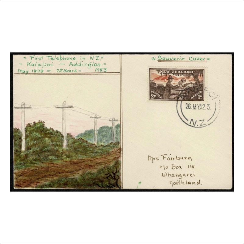 1952 (26MY) Purdon Handdrawn ‘First Telephone in NZ/Kaiapoi-Addington May 1878 - 75 Years - 1953’ Has ‘46 2d Health tied by Kaiapoi cancel. Nice Illustration (1)