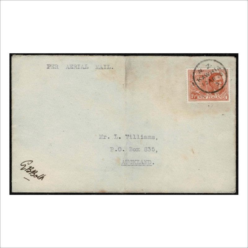 1920 (12AP) First Flight Cover Kawhia-Auckland NZAMC 16c with 1 1/2d Victory tied by Kawhia cancel. The cover signed by GB Bolt at bottom left. The cover lightly aged with a light vertical crease. Very Scarce (1)