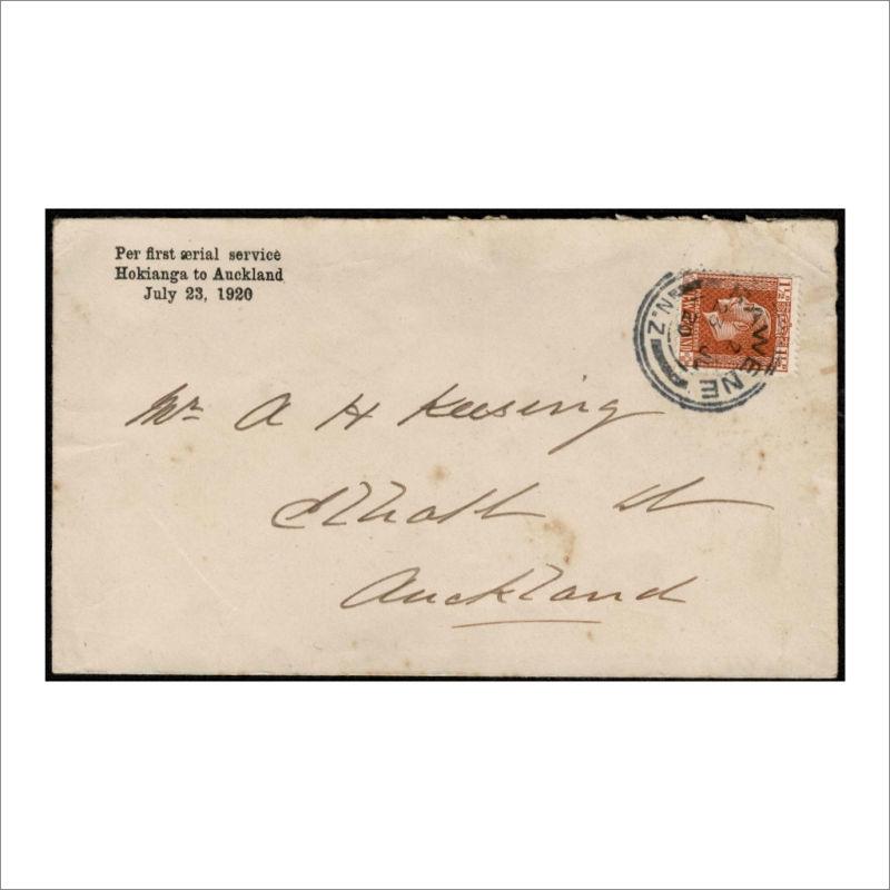 1920 (23JL) First Flight Cover ‘Per first aerial service/Hokianga to Auckland/July 23,1920’ Printed at top left. Rawene to Auckland flight NZAMC #22f. Has Cooper & Son/Big Drapery Stores/Rawene Cinderella label on the back untied. The Cover has light ageing. Very Scarce (1)