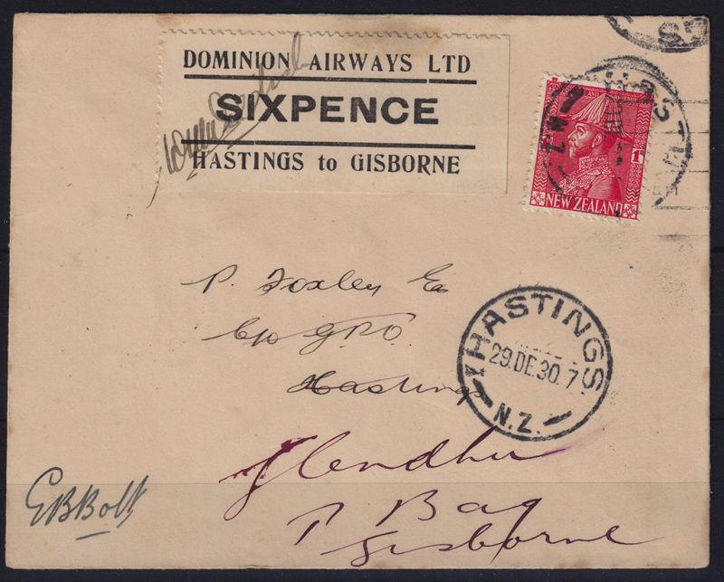 1930 (29DE) Dominion Airway Ltd/Sixpence/Hastings to Gisborne with 1d FM tied by Hastings cancel to Gisborne. Signed by GB Bolt. Non Verne Collins Cover. Light stain at top. (1)