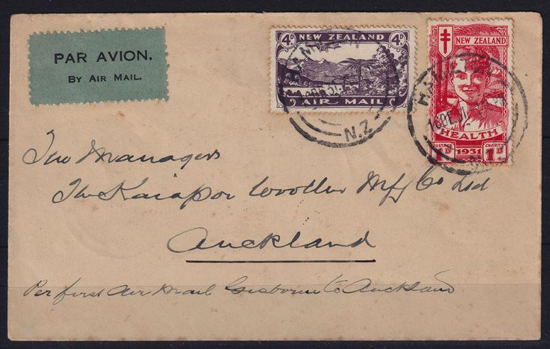1931 (10DE) Airmail Cover endorsed ‘Per Airmail Gisborne to Auckland. Has 4d Air & ‘31 1d Red Boy tied by Hamilton. Backstamped Auckland. Also has Kaiapoi Woollen Goods Kiwi label untied. The cover has light ageing (1)