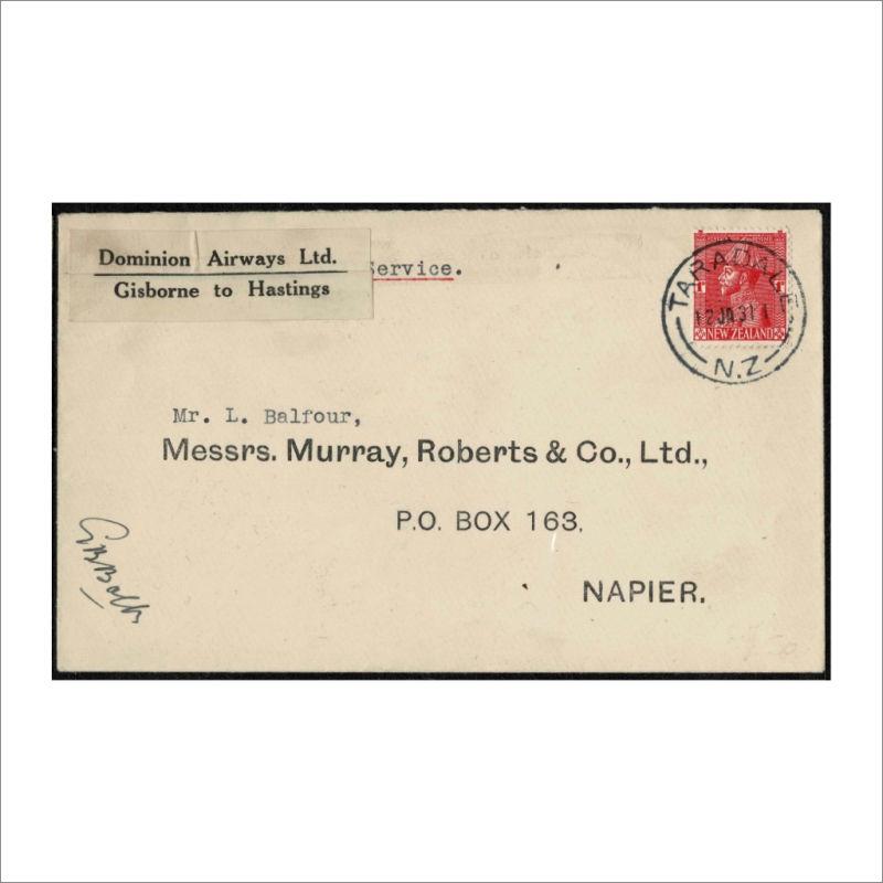 1931 (12JA) Dominion Airways Ltd/Gisborne to Hastings Flight Covers addressed to Messrs Murray,Roberts & Co Ltd,Napier. Has 1d FM tied by Taradale cancel. Signed by G B Bolt. Interesting labels Used. Not a Verne Collins Cover (1)