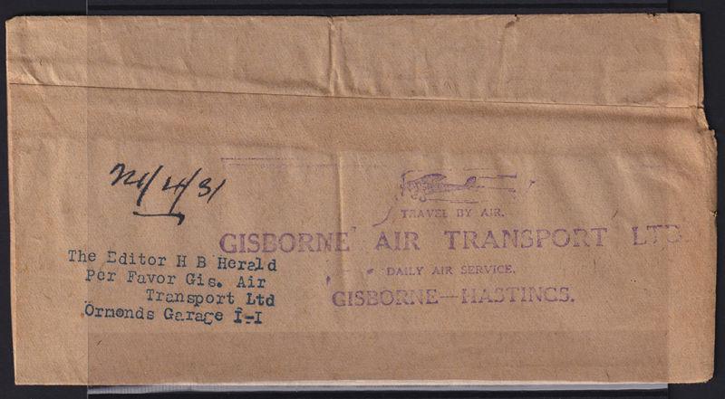 1931 (MR4) Gisborne Air Transport Ltd/Daily Air Service/Gisborne-Hastings violet cachet on Brown Wrapper addressed to ‘The Editor HB Herald,Per Favor Gis.Air,Transport Ltd,Ormonds Garage. (1)