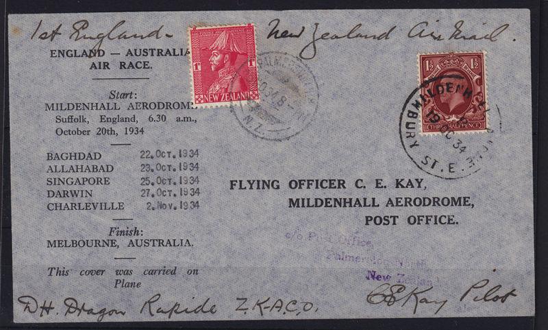 1934 (19OC) MacRobertson Centenary Air Race Printed Cover endorsed ‘DH Dragon Rapside ZKACO signed by CE Kay Posted at London and has additional 1d FM tied by Palmerston North cancel. (1)