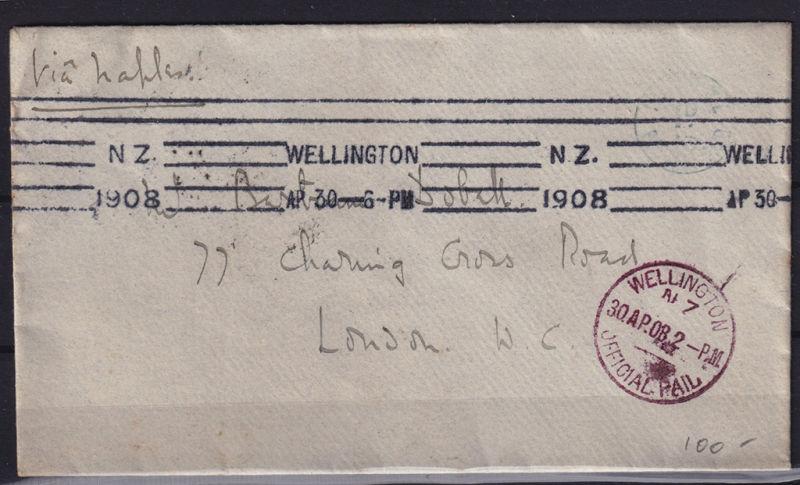 1908 (AP30) W&G Turnbull & Co Printed Cover with 1d Black Meter cancelled by Wellington machine cancel to London. Also Wellington Official Paid red cancel. Backstamped London W.C. (1)
