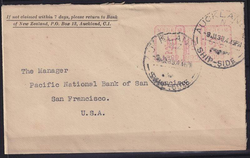 1939 (9JA) Bank of NZ Printed envelope to USA with 1/2d,1d,2d Red Meters cancelled by Auckland Ship-side cancels. No backstamps. (1)