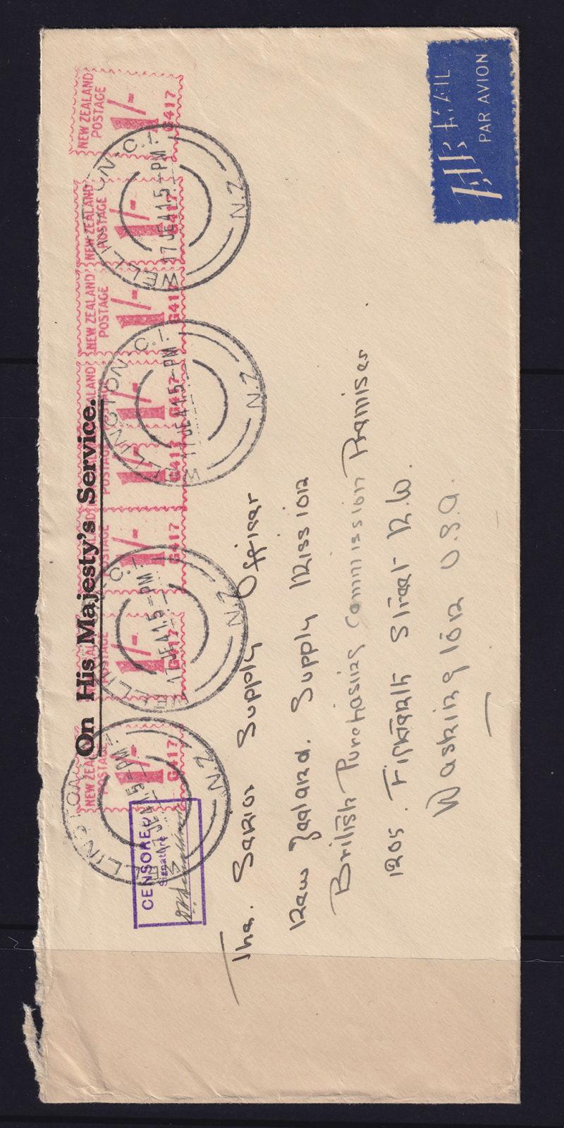 1941 (17JE) Long Censored OHMS Cover to USA with 8x 1/- Red Meter Marks cancelled by Wellington cancels. Backstamped with Defence/OHMS/Headquarters violet cachet. Fine Meter Cover.(1)