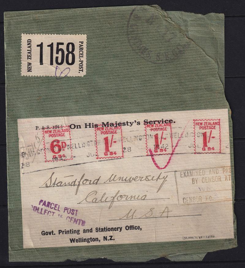 1942 (JL28) Large Parcel Piece with OHMS/Govt Printing and Stationery Office Wellington NZ Printed label to USA with Red 6d,1/-(3) Meters cancelled by Wellington machine cancel. Also has violet ‘Parcel Post/Collect 15 Cents’ cachet. On the back has a Customs Declaration Form plus US 5c & 10c Dues ti