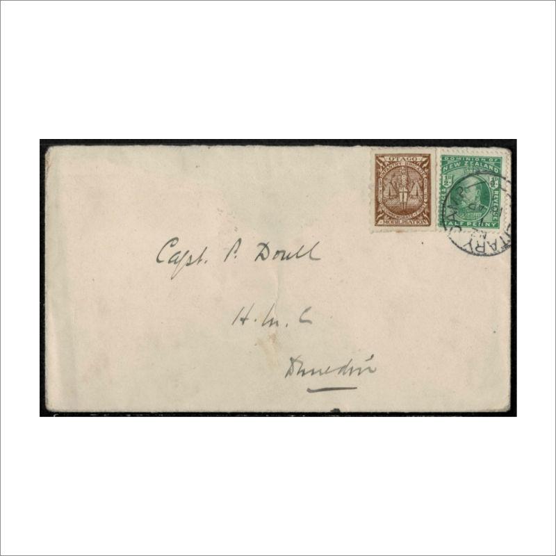 1913 (18AP) Cover with KEVII 1/2d Green plus untied Otago Mobilsation label addressed to Capt P Doull,HMC,Dunedin. Used at Sutton Military Camp. Territorial Mail. No backstamps and missing the flap. Scarce (1)