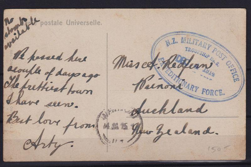 1914 (DE4) Port Said Picture Postcard Stampless to NZ with fine blue oval ‘NZ Military Post Office/Troopship No 8/Expeditionary Force’ Used on HMNZ T Star of India. Has Wainoni 14 JA 15 receiving cancel. Fine Troopship WW1 Card (1)