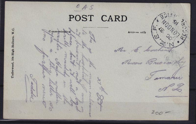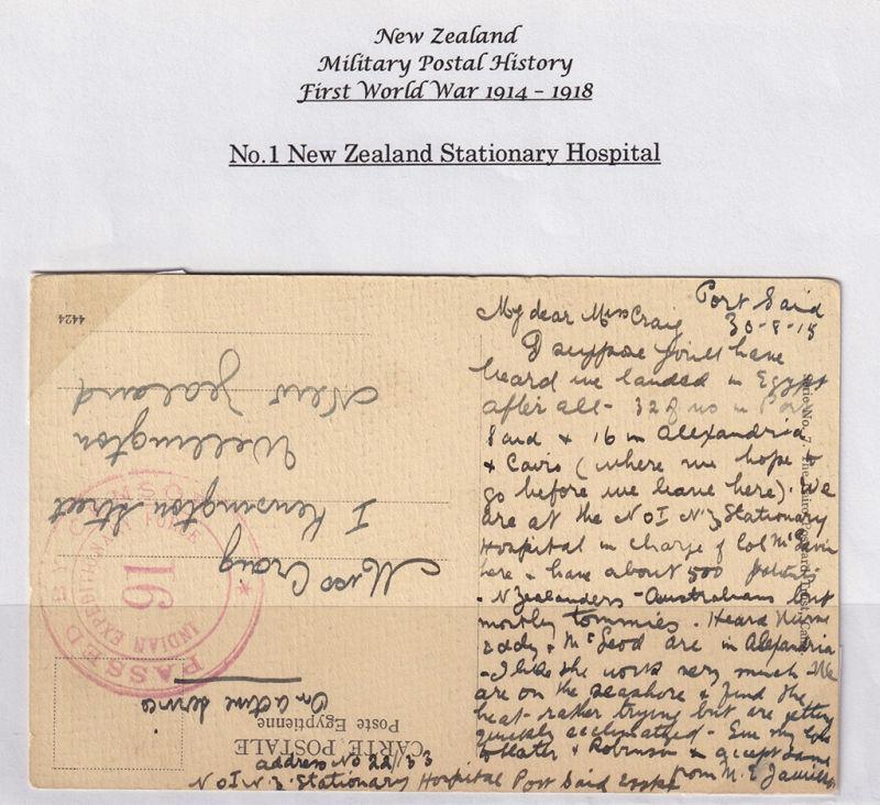1915 (30AU) Stampless Postcard endorsed ‘No.1 New Zealand Stationary Hospital’ written by Staff Nurse Mabel Jamieson of Kumara at Port Said to NZ. Interesting message about the hospital and patients. Has the Red Indian Expeditionary Force large censor. (1)